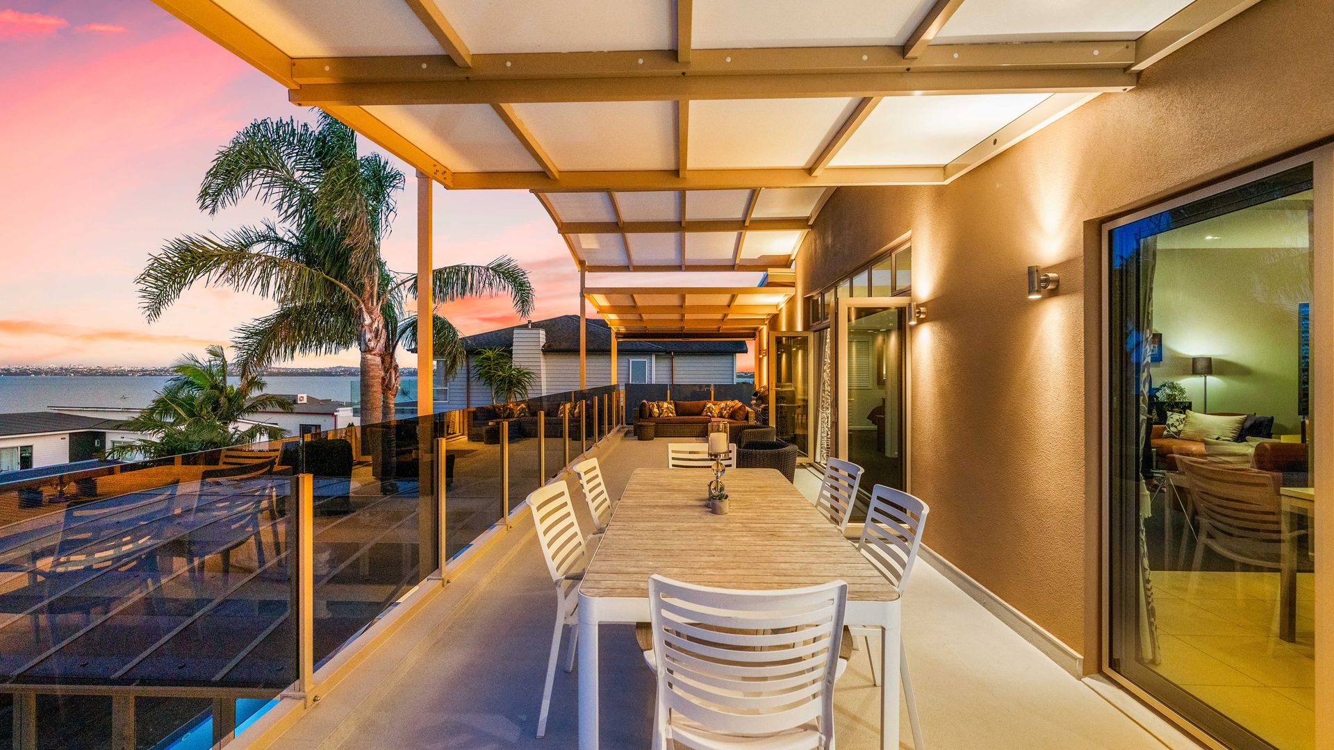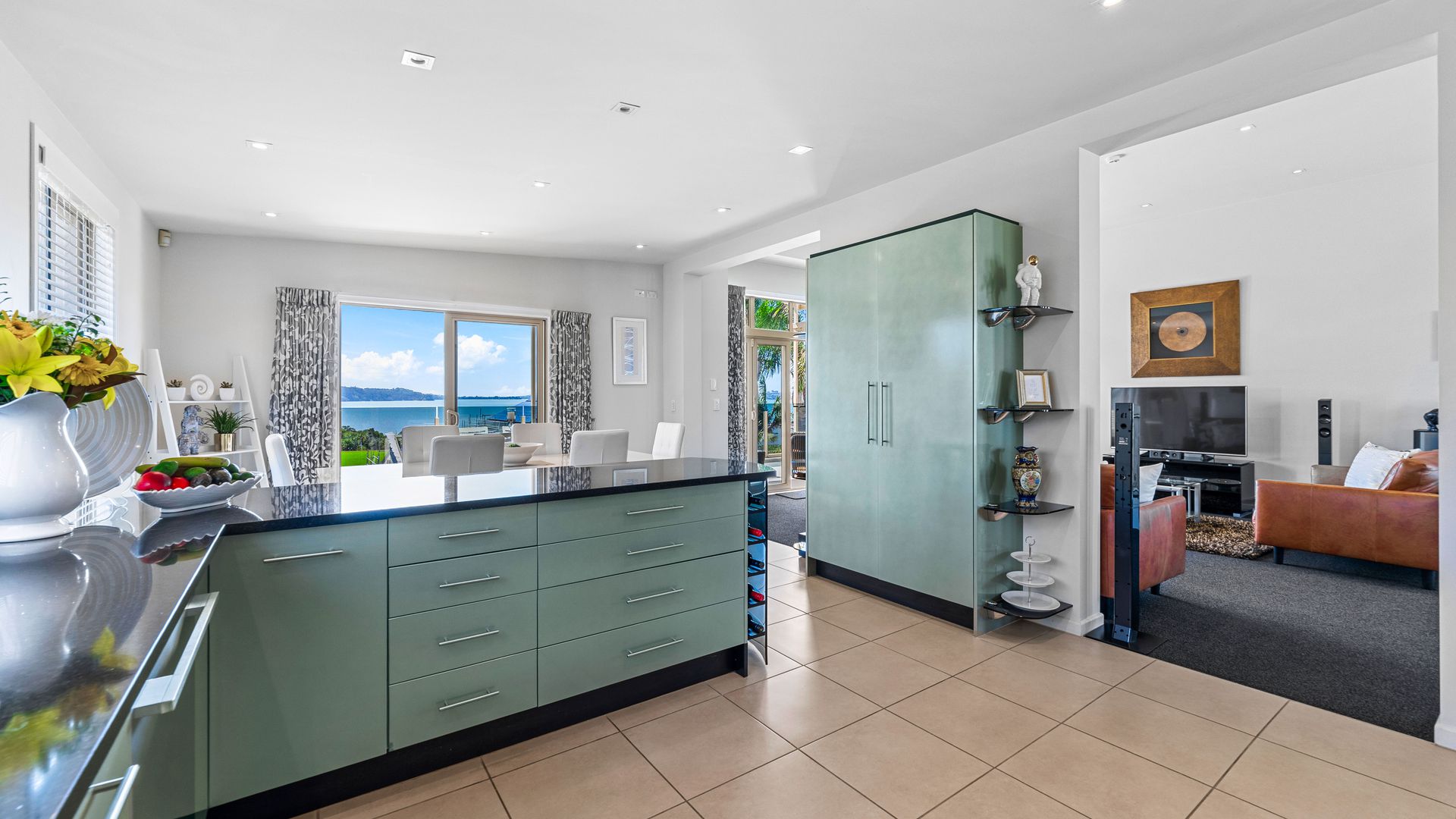 A beautifully configured open-plan kitchen, dining and living zone unfolds with purpose—ideal for entertaining, yet equally suited to quiet evenings. From here, expansive decking invites you outdoors, where sweeping views stretch across the water to the Auckland city skyline and the Harbour Bridge. An ever-changing backdrop that elevates everyday living.