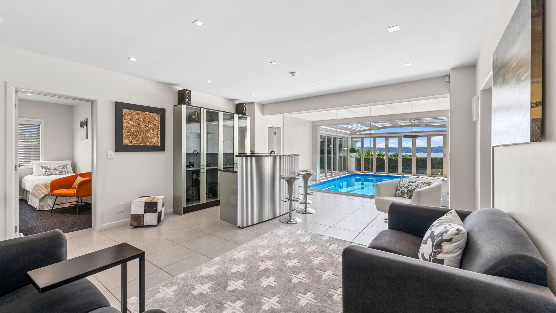 Downstairs, the home continues to impress with four additional bedrooms, two bathrooms, and a second optional living space with its own bar—perfect for year-round entertaining.